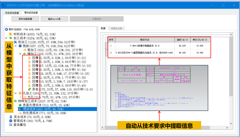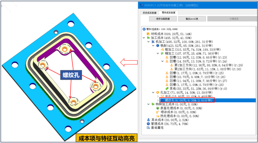 • 成本項(xiàng)與制造特征直接關(guān)聯(lián)顯示,即時(shí)估算加工成本