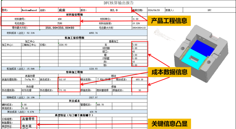 開(kāi)目3DDFC 是一款基于 MBD 模型和工藝知識(shí)庫(kù)的專業(yè)三維制造成本分析與估算軟件,在不依賴詳細(xì)工藝路線的情況下,根據(jù)零件幾何信息和精度信息一鍵式完成成本估算。該軟件充分融入“并行工程”的關(guān)鍵思想,并基于開(kāi)目的三維設(shè)計(jì)模型特征識(shí)別技術(shù),以及零件加工成本計(jì)算模型,能快速獲得相對(duì)準(zhǔn)確的加工成本。為面向成本的設(shè)計(jì)優(yōu)化提供參考指引,也為企業(yè)對(duì)外產(chǎn)品報(bào)價(jià)或產(chǎn)品外協(xié)件采購(gòu)價(jià)格提供量化依據(jù),實(shí)現(xiàn)降本增效。