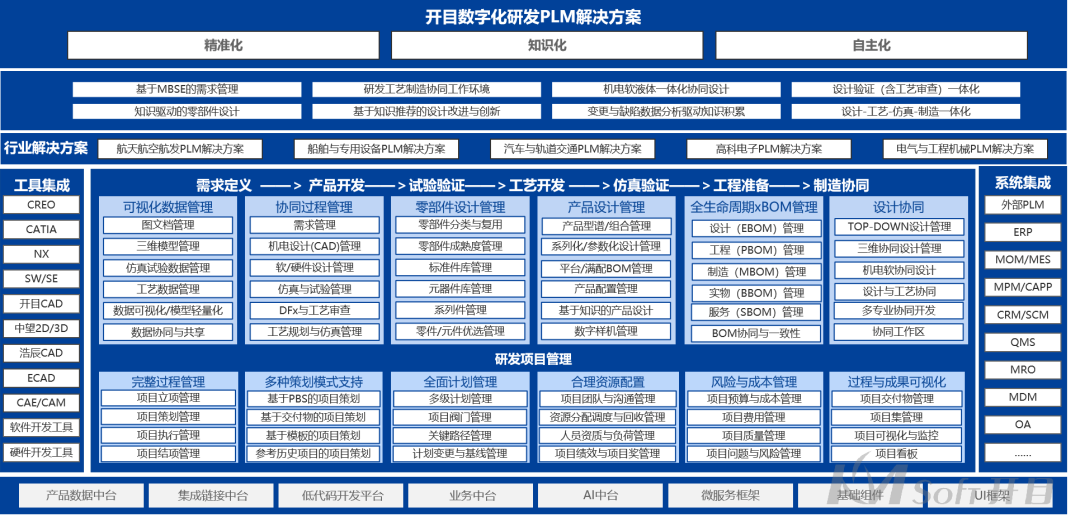 KMPLM CLOUD能夠構(gòu)建適應(yīng)企業(yè)數(shù)字化轉(zhuǎn)型趨勢(shì)的典型應(yīng)用APP,包括基于MBSE的需求管理、產(chǎn)品研發(fā)項(xiàng)目協(xié)同工作環(huán)境、機(jī)電軟一體化協(xié)同設(shè)計(jì)、設(shè)計(jì)驗(yàn)證(含工藝性審查)一體化、基于特征推理的智能零件工藝設(shè)計(jì)、結(jié)構(gòu)化工藝設(shè)計(jì)與仿真一體化、變更與缺陷數(shù)據(jù)分析驅(qū)動(dòng)知識(shí)積累等。