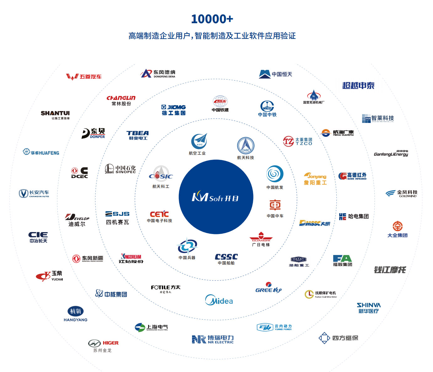 經(jīng)過30多年的實踐,開目軟件已積累了航空航天、兵器船舶、高科技電子、汽車、工程機械等行業(yè)的多家標桿客戶,其產品被廣泛應用于航發(fā)、兵裝、電科等軍工集團,以及中國鐵建、中國中車等中國500強高端制造業(yè)龍頭企業(yè),并為國產大飛機、航空發(fā)動機、中國高鐵、大型盾構機等重大型號工程提供了先進的數(shù)字化技術支撐,高端客戶市場占有率在國產工業(yè)軟件中名列前茅。