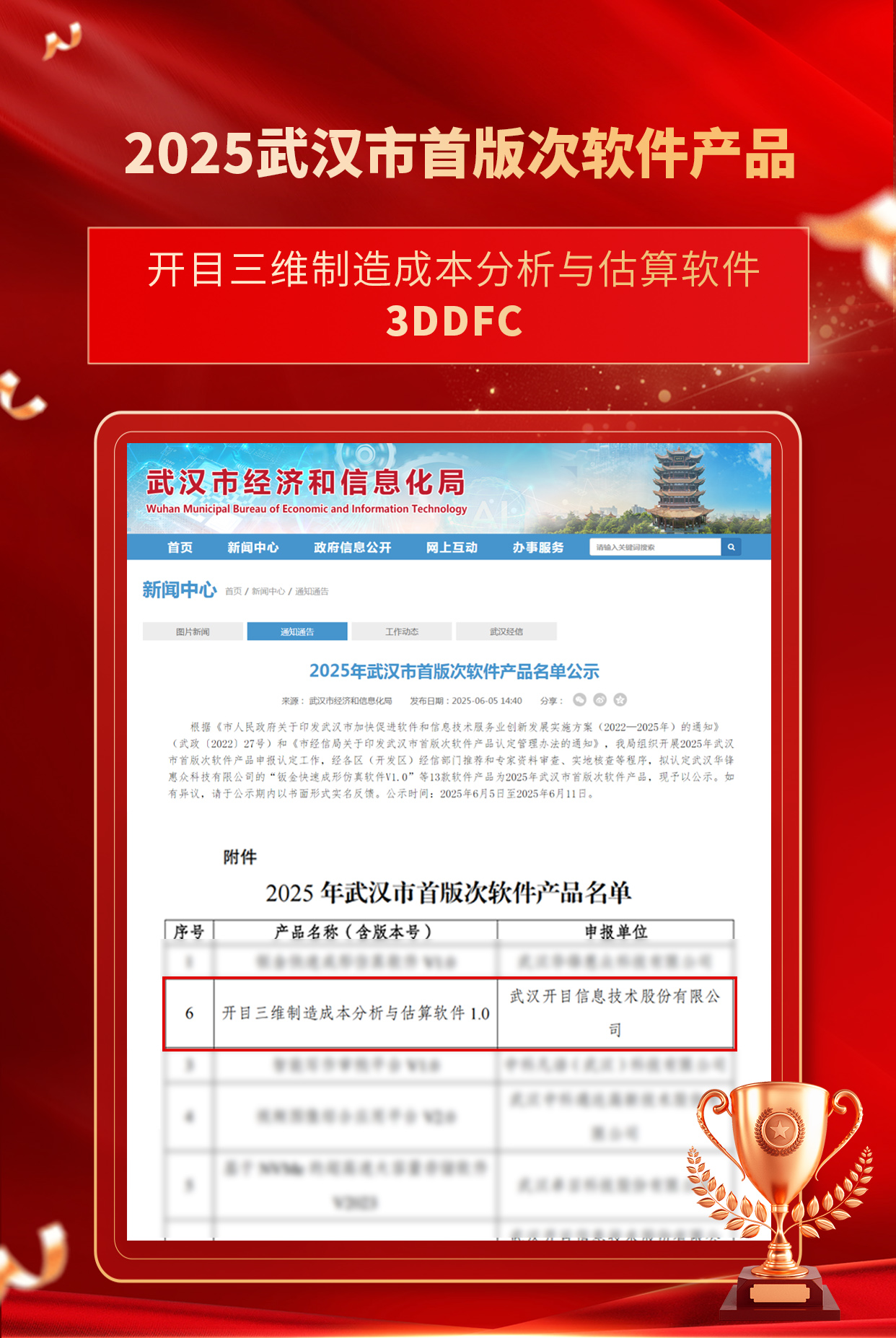 喜訊!開目三維制造成本分析與估算軟件入選武漢市首版次軟件產(chǎn)品