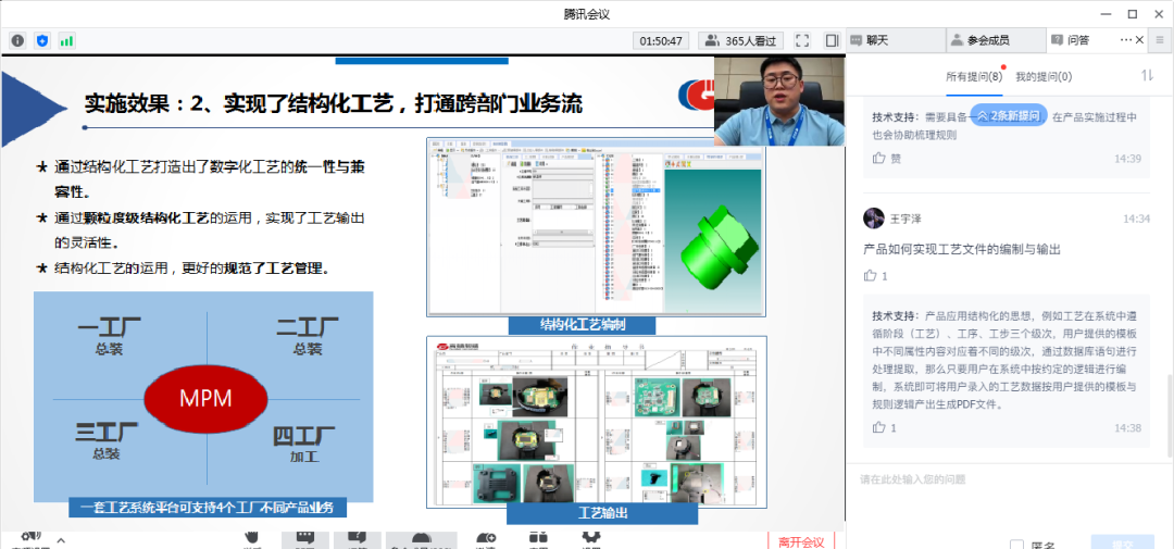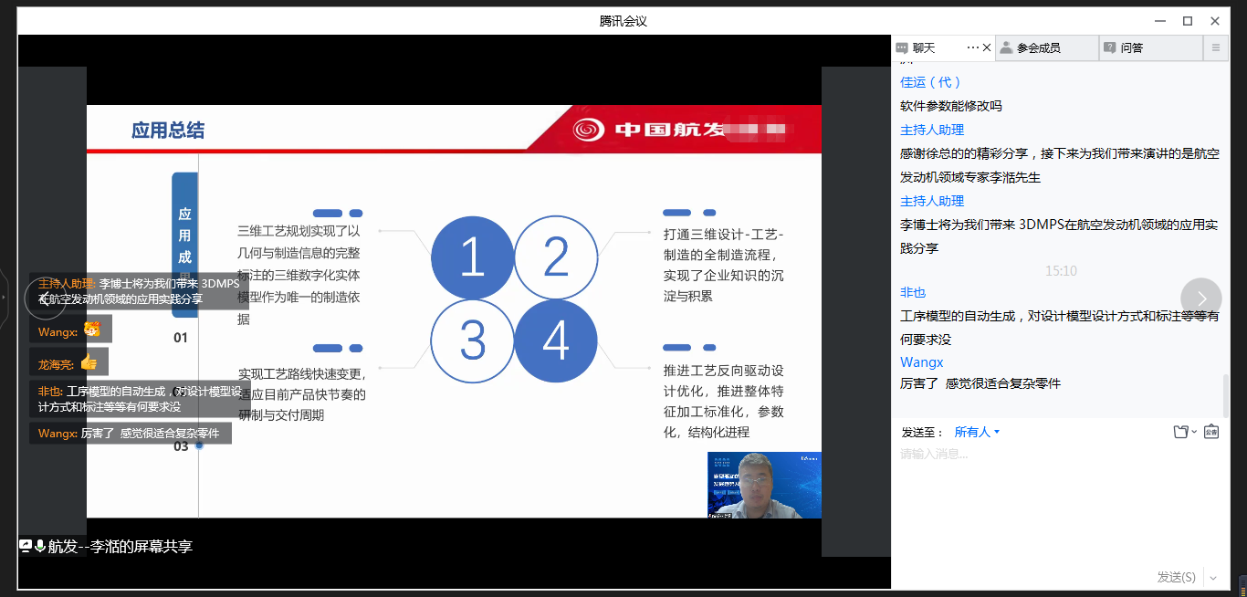 3DMPS能識(shí)別航空發(fā)動(dòng)機(jī)類(lèi)復(fù)雜零件所有制造特征嗎?航發(fā)集團(tuán)使用3DMPS 生成NC代碼嗎?與CAM 如何銜接?3DMPS可以一次性生成工序過(guò)程圖嗎?連線(xiàn)研討環(huán)節(jié),參會(huì)嘉賓踴躍互動(dòng),徐總和李湉博士?jī)A囊相授,就企業(yè)在三維環(huán)境下如何編制機(jī)加工藝,如何利用已有工藝知識(shí)通過(guò)3DMPS提升工作效率,推進(jìn)機(jī)加工藝標(biāo)準(zhǔn)化、參數(shù)化、結(jié)構(gòu)化進(jìn)程發(fā)表專(zhuān)業(yè)意見(jiàn),大家點(diǎn)贊不止。