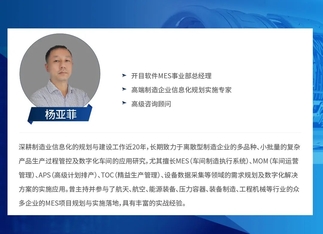 本期研討會特邀開目公司MES事業(yè)部總經(jīng)理楊亞菲、四機賽瓦生產(chǎn)總監(jiān)黃志軍、廣日電梯信息中心副主任付東軍做客開目線上直播間,專家將全程在線答疑,與來賓深入探討開目制造執(zhí)行系統(tǒng)MES的優(yōu)勢特點與實際落地應(yīng)用。