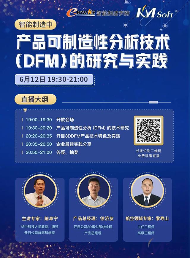 為了幫助廣大制造企業(yè)提升產品的可制造性,縮短研發(fā)周期,提高設計質量,開目軟件定于6月12日19:30-21:00舉辦“DFM可制造性分析技術發(fā)展與應用實踐”在線研討會,特邀華中科技大學教授、博導、開目公司首席科學家陳卓寧先生,航空領域專家、主任工程師、高級工程師黎壽山先生,開目公司3D事業(yè)部總經理、產品總經理徐濟友先生進行講座,并邀請了e-works總編黃培博士主持在線交流。
