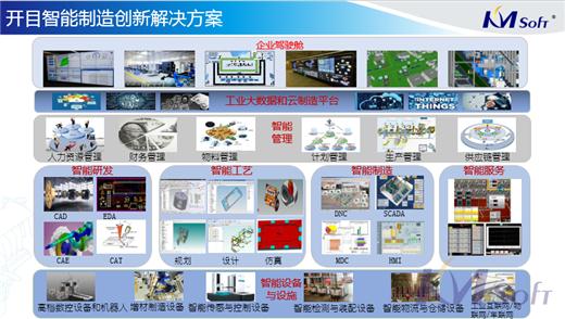 新產(chǎn)品中,開目智能制造整體解決方案是開目公司依據(jù)“中國制造2025”總體規(guī)劃要求,提出針對離散型制造企業(yè)的智能制造系統(tǒng)解決方案,該方案通過對物聯(lián)網(wǎng)、云計算、大數(shù)據(jù)、人工智能等先進技術(shù)的融合創(chuàng)新方式,為制造企業(yè)提供包括智能研發(fā)、智能工藝、智能生產(chǎn)、智能管理、智能服務(wù)、智能設(shè)備、云制造平臺、系統(tǒng)集成等全方位的軟硬件產(chǎn)品,并提供資源整合、立項策劃、項目實施、宣傳推廣等全流程的智能制造項目服務(wù)。
