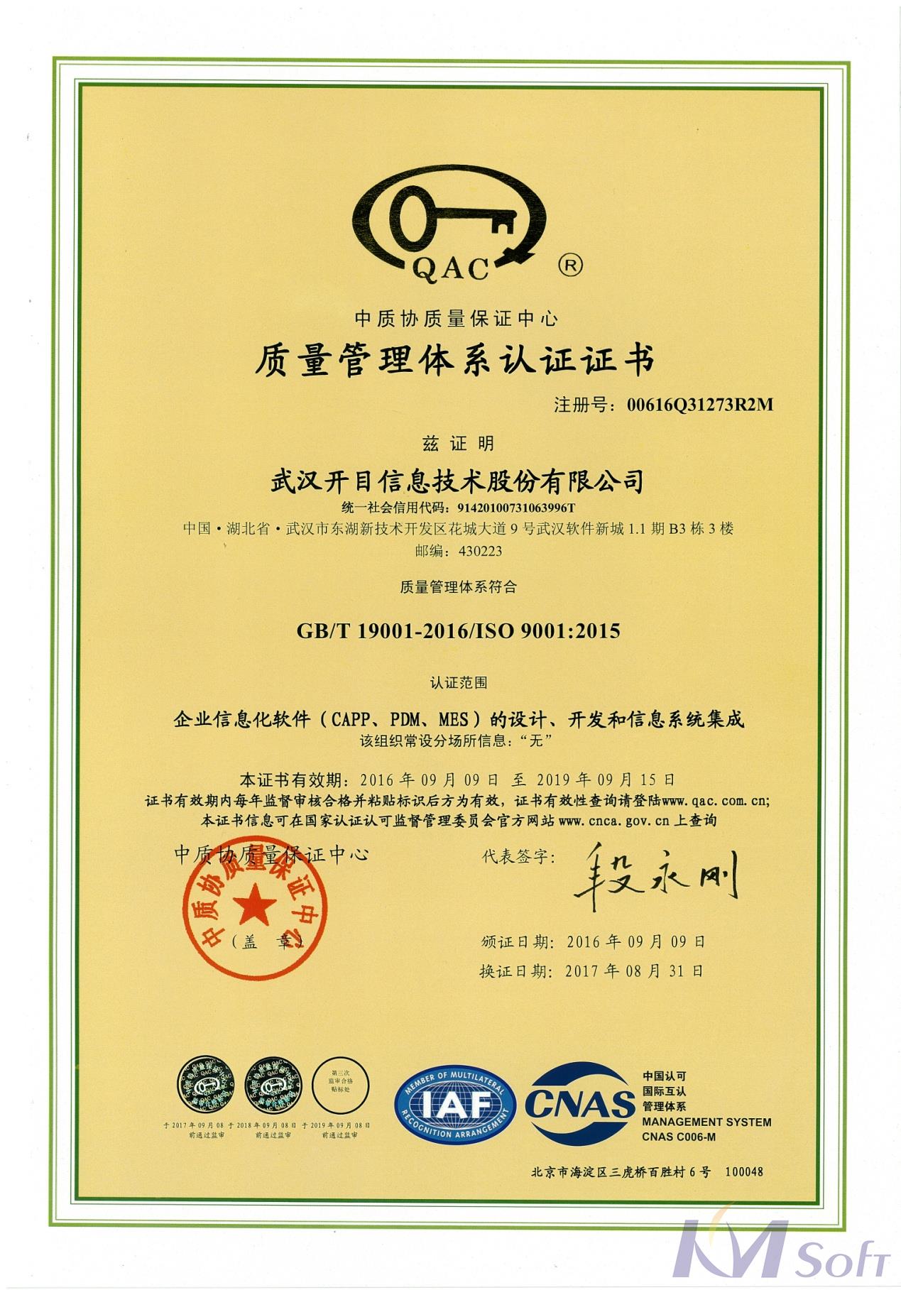 開目公司作為中國最大、實力最強的離散制造企業(yè)智能工藝創(chuàng)新平臺軟件產品研發(fā)及方案提供公司,將管理體系建設作為公司發(fā)展過程中常抓不懈的一項重要工作,此次順利通過了ISO9001的認證審核,是對公司的一種肯定,表明公司能持續(xù)穩(wěn)定地向顧客提供預期和滿意的合格產品。