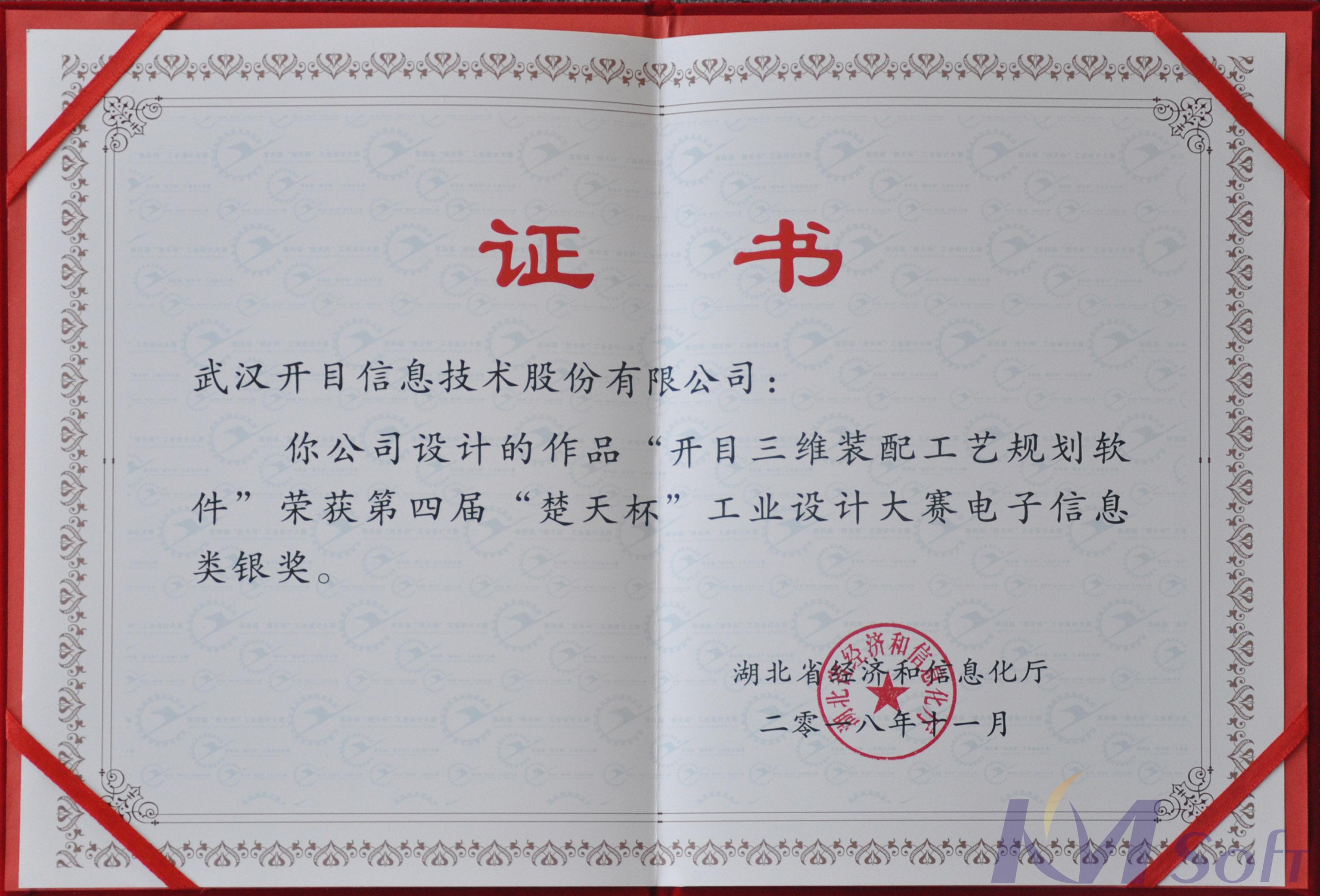 2018年11月23日,由湖北省經(jīng)信委主辦的第三屆中國(guó)優(yōu)秀工業(yè)設(shè)計(jì)獎(jiǎng)湖北分區(qū)賽暨第四屆“楚天杯”工業(yè)設(shè)計(jì)大賽獲獎(jiǎng)作品展暨頒獎(jiǎng)儀式在武漢隆重舉行,武漢開目信息技術(shù)股份有限公司自主研制的開目三維裝配工藝規(guī)劃軟件3DAST榮獲第四屆“楚天杯”工業(yè)設(shè)計(jì)大賽銀獎(jiǎng)。
