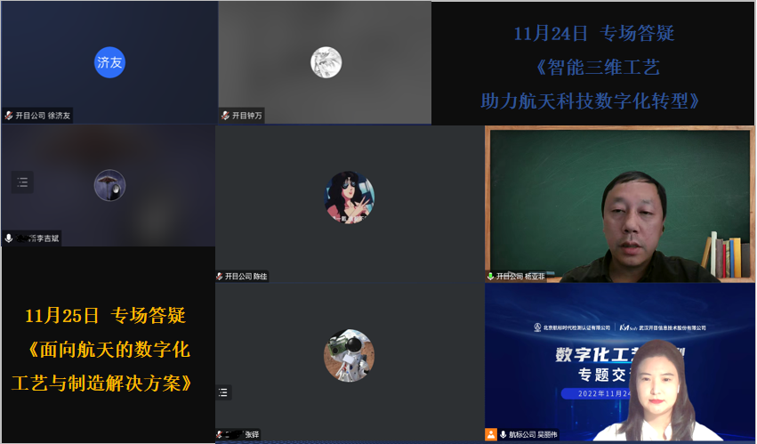 11月24-25日,開目軟件聯(lián)合北京航標(biāo)時代檢測認(rèn)證有限公司舉辦的航天科技“數(shù)字化工藝轉(zhuǎn)型”2場專題交流會圓滿落幕。開目公司3D事業(yè)部、MES事業(yè)部、咨詢顧問部的專家領(lǐng)導(dǎo)與開目航天科技的典型用戶:五院、九院的數(shù)字化工藝專家,共同就數(shù)字航天的工藝與制造技術(shù)展開深入交流和研討,航天科技集團(tuán)旗下50+所屬單位,約150余名數(shù)字化、信息化領(lǐng)導(dǎo),工藝師等線上參會,反響熱烈。