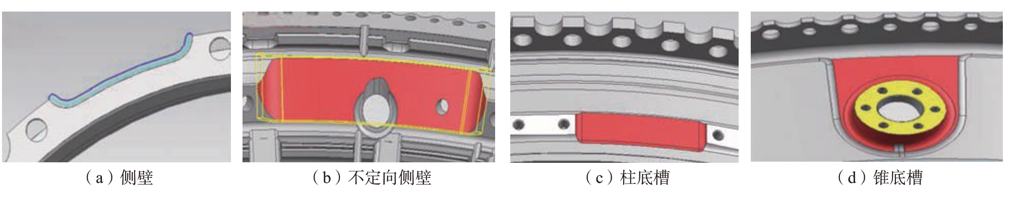 機(jī)匣零件特征主要分為回轉(zhuǎn)面系、錐底槽、側(cè)壁、孔系、平面、環(huán)槽等類型特征,按照加工方法進(jìn)行定義,如圖2 所示。