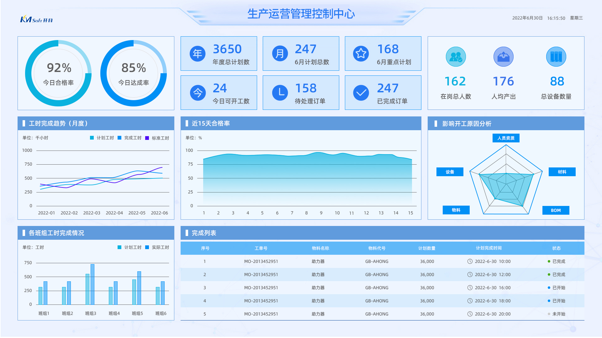 KMMOM CLOUD V3.0涵蓋生產(chǎn)管理、計(jì)劃排程、制造執(zhí)行、倉儲管理、質(zhì)量管理、工時(shí)管理、設(shè)備管理、工裝管理、外委管理等核心功能,實(shí)現(xiàn)高端制造從訂單-計(jì)劃-生產(chǎn)交付的全鏈路數(shù)據(jù)穿透與端到端智能閉環(huán)管理,提升企業(yè)制造運(yùn)營效率與產(chǎn)品交付能力。KMMOM支持多種途徑的訂單接收和拆分、排程優(yōu)化以及資源分配和任務(wù)下達(dá),實(shí)現(xiàn)訂單狀態(tài)的實(shí)時(shí)動態(tài)追蹤,以及多層級多維度的生產(chǎn)監(jiān)控;