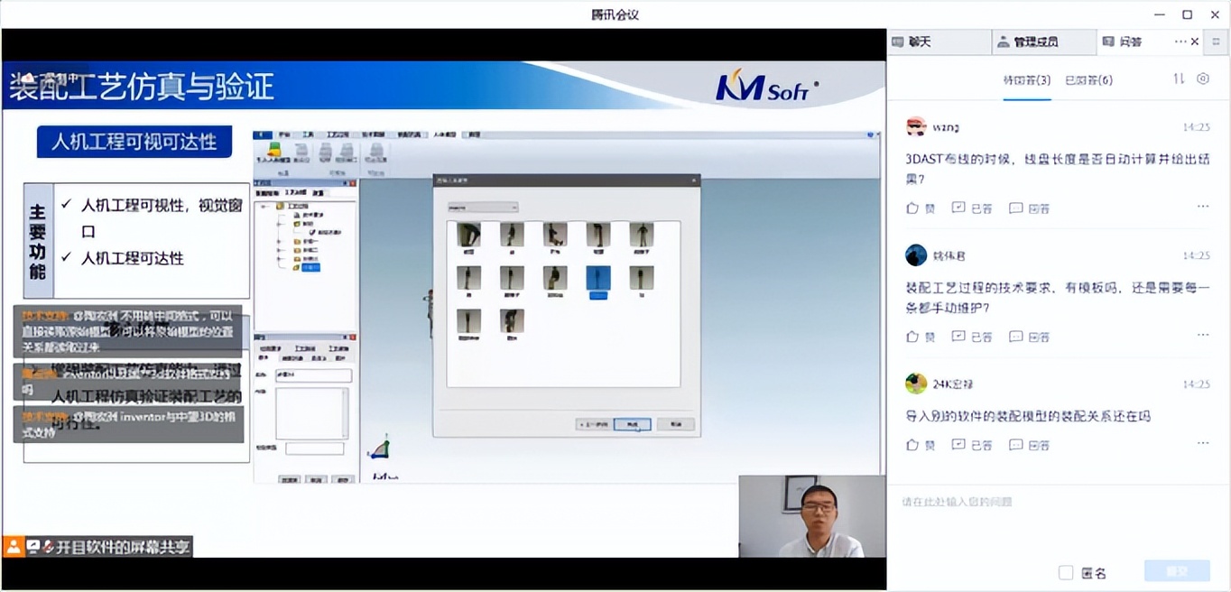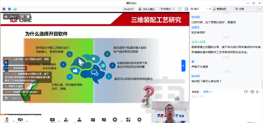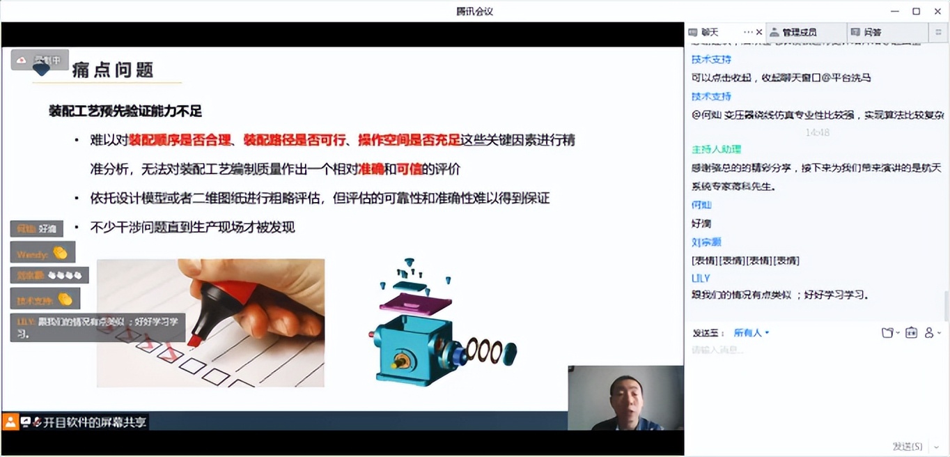 中車(chē)浦鎮(zhèn)如何分階段推進(jìn)實(shí)施3DAST?航天企業(yè)是如何實(shí)現(xiàn)精密復(fù)雜的裝配工藝?線(xiàn)纜長(zhǎng)度是否自動(dòng)計(jì)算并給出結(jié)果?能否引入企業(yè)的工裝工具?工藝裝備庫(kù)是否可以自己擴(kuò)展?在連麥互動(dòng)研討環(huán)節(jié),大家紛紛踴躍參與連線(xiàn)互動(dòng),探討制造企業(yè)如何部署和應(yīng)用三維裝配工藝規(guī)劃與仿真系統(tǒng),專(zhuān)家們給以制造企業(yè)細(xì)致的回復(fù)、專(zhuān)業(yè)的建議獲得參會(huì)嘉賓的一致好評(píng)。