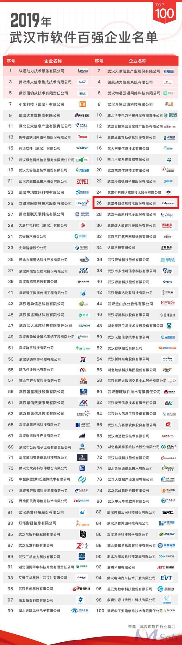 7月31日,武漢市經濟和信息化局、武漢市軟件行業(yè)協(xié)會發(fā)布了“2019年武漢市軟件百強企業(yè)發(fā)布會”,武漢開目信息技術股份有限公司光榮入選本次百強榜單。