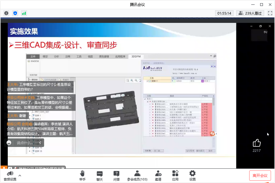 連線研討環(huán)節(jié),參會代表積極參與,踴躍互動:工藝的規(guī)劃和審查規(guī)則是基于什么標(biāo)準(zhǔn)制定,是否支持用戶自定義呢?DFM能否審查二維圖紙,二維與三維的尺寸標(biāo)注如何進(jìn)行審查?開目3DAST模型輕量化能對模型優(yōu)化多少比例,輕量化轉(zhuǎn)換后會不會存在模型數(shù)據(jù)丟失或信息缺失?3DMPS中工藝路線如何生成?如何實(shí)現(xiàn)工藝快速變更呢?工藝流程圖如何形成?三維工藝下車間如何實(shí)現(xiàn)?工藝制造一體化如何實(shí)現(xiàn)?······