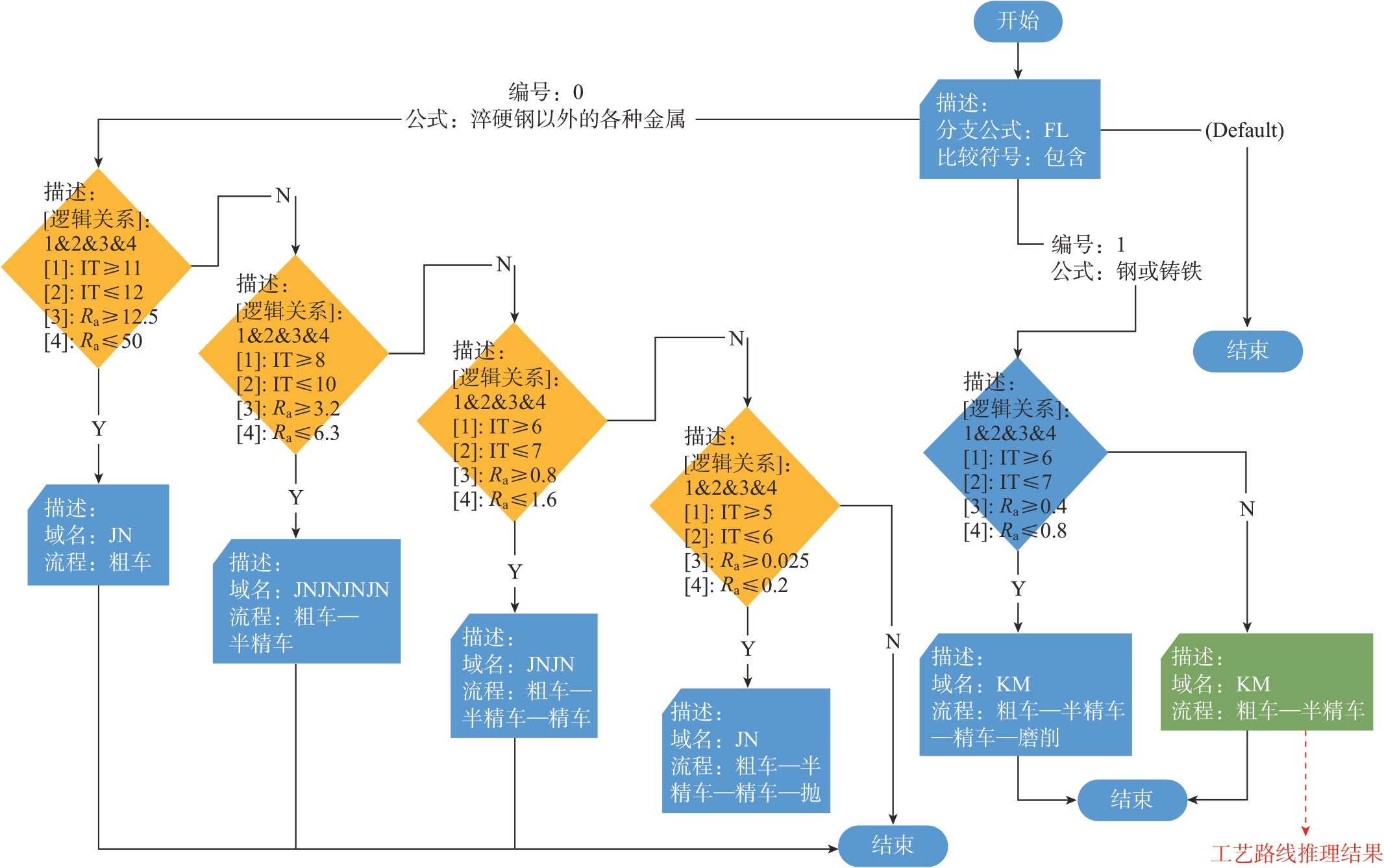 把工藝知識(shí)用可視化的流程圖的方式表達(dá)。流程定義包括流程圖的繪制、流程圖中圖元的屬性確定等工作。簡化的加工方法推理流程判定邏輯如圖7所示。