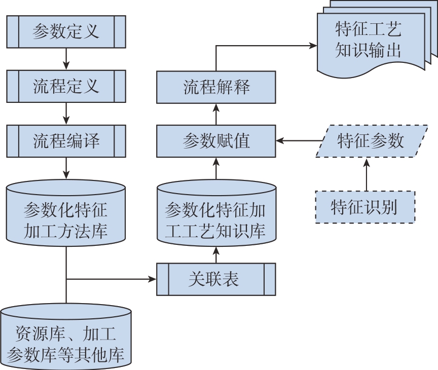 構(gòu)建一個(gè)參數(shù)化工藝設(shè)計(jì)平臺(tái)來使用工藝知識(shí)庫中的加工方法推理邏輯流程,通過采用參數(shù)過程圖技術(shù)實(shí)現(xiàn)特征工藝知識(shí)的表達(dá)、定義、解釋和輸出。定義參數(shù)過程圖是工藝知識(shí)表達(dá)和應(yīng)用的核心模塊,其核心功能主要包括參數(shù)定義、流程定義、流程解釋等功能,如圖6 所示。
