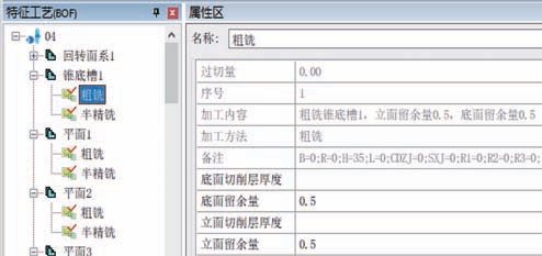 針對機(jī)匣類型零件,定義一套加工知識(shí)庫,基于識(shí)別的特征的幾何信息與制造信息進(jìn)行加工方法推理,推理出特征的加工步驟以及余量。如機(jī)匣中的錐底槽特征經(jīng)過知識(shí)庫的推理得出的加工步驟為“粗銑—半精銑”,且粗銑的底面與立面的余量為0.5 mm,如圖4所示。