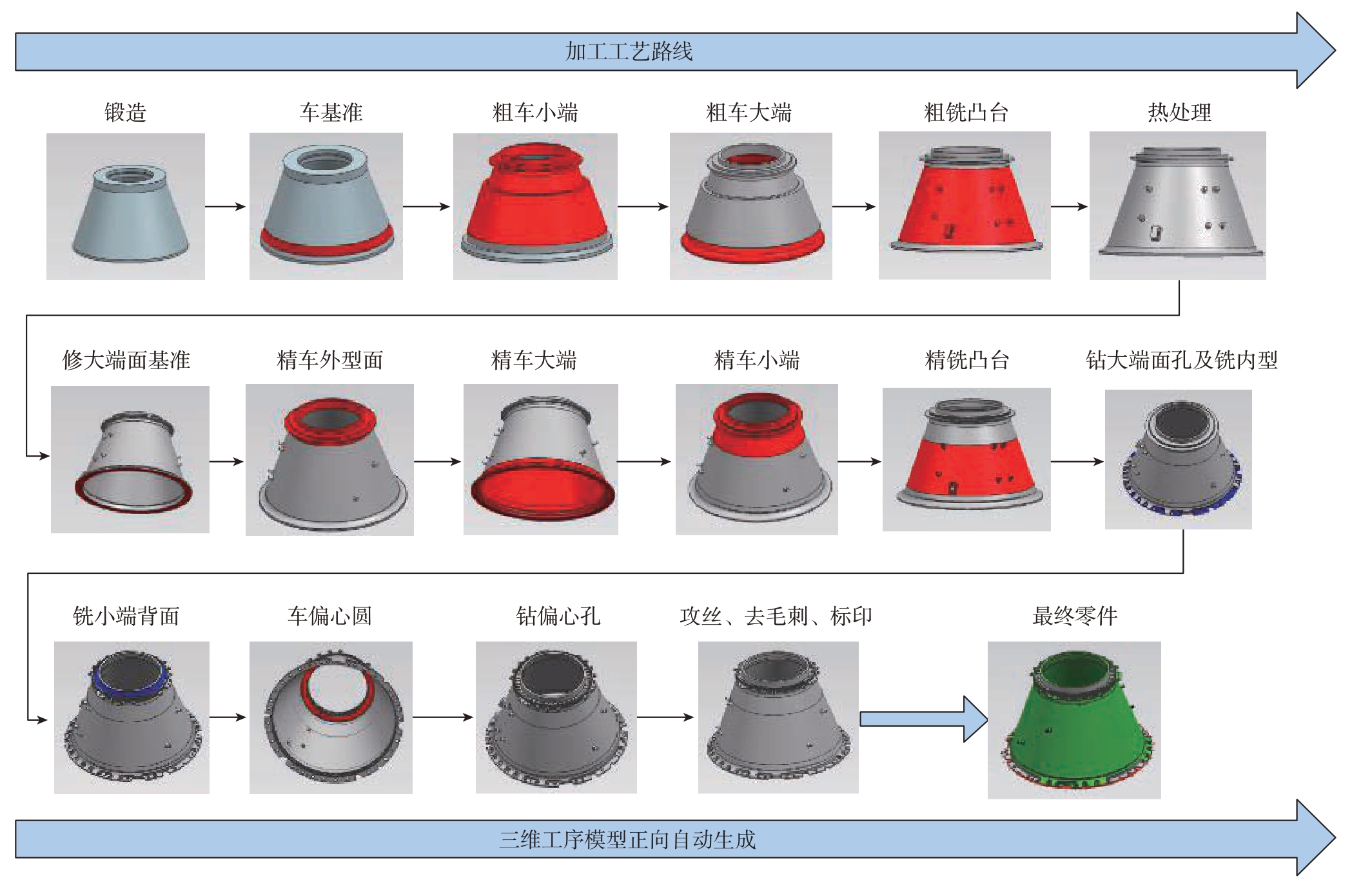 (2)通過工藝推理獲得特征的加工步驟與余量,然后根據(jù)典型機(jī)匣工藝模板確定機(jī)匣零件工藝路線,自動(dòng)構(gòu)建三維工藝模型,典型機(jī)匣零件加工過程如圖12 所示。