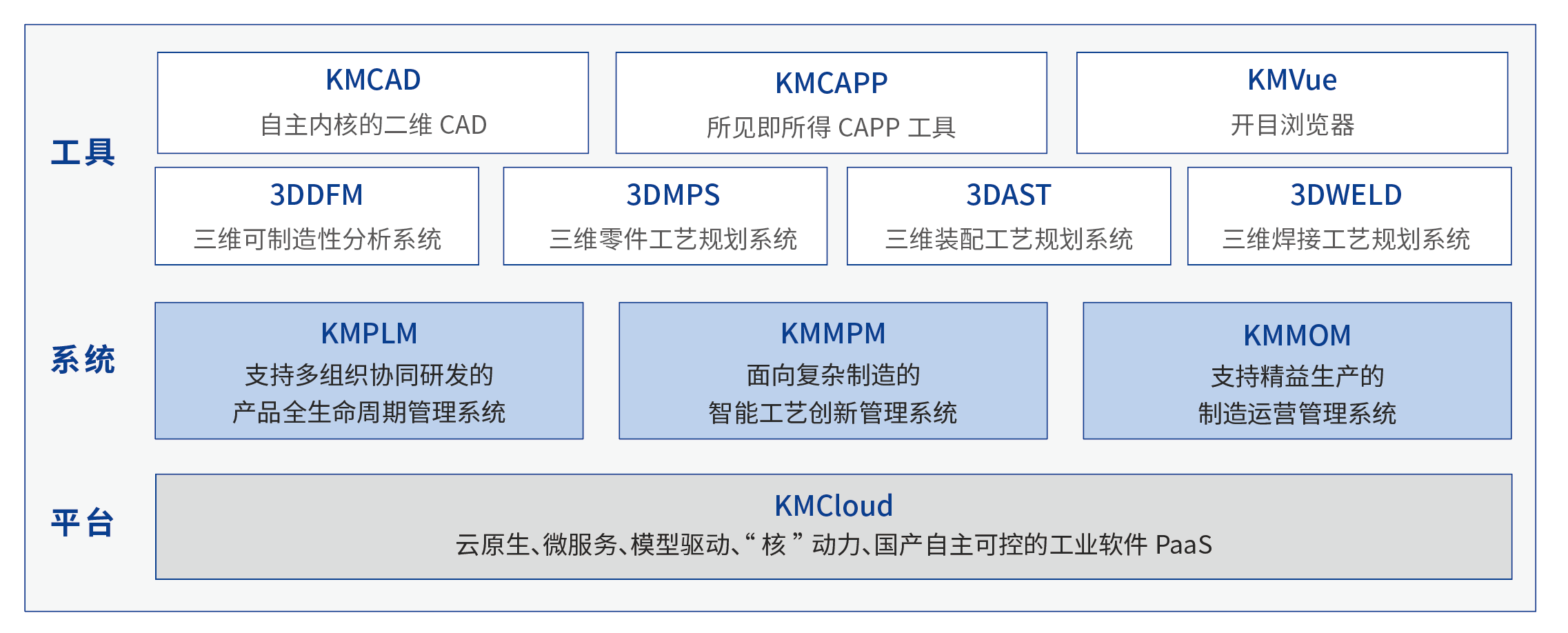 “1”即KMCloud 平臺(tái),是開目推出的基于云原生、微服務(wù)、模型驅(qū)動(dòng)、“核”動(dòng)力、國(guó)產(chǎn)自主可控的工業(yè)軟件PaaS,支持多組織、多租戶、跨地域高效協(xié)同,為企業(yè)構(gòu)建數(shù)字化研發(fā)、數(shù)字化工藝、數(shù)字化制造等業(yè)務(wù)場(chǎng)景提供了堅(jiān)實(shí)的底座;“3”即KMPLM、KMMPM、KMMOM三個(gè)管理系統(tǒng);“X”即KMCAD、KMCAPP、KM3DDFM、KM3DAST、KM3DMPS、KM3DWELD、KMVue等一系列研發(fā)設(shè)計(jì)類工具軟件。