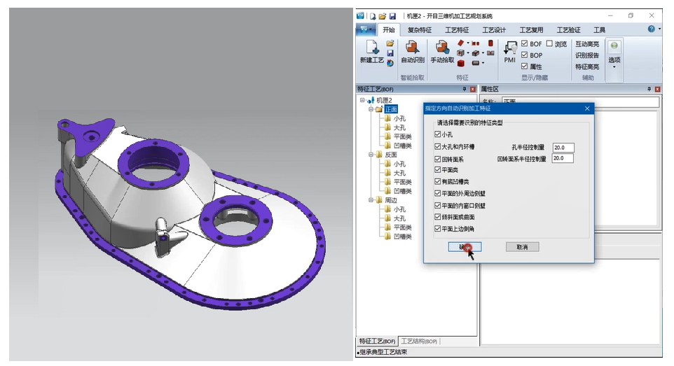 3DMPS 11.0開(kāi)放了更多加工特征類(lèi)型,支持對(duì)特征的輪廓進(jìn)行二次編輯,以適應(yīng)不同的加工場(chǎng)景;支持按照方向一鍵自動(dòng)識(shí)別大部分特征,大大減少了零件特征分析所需時(shí)間,并增強(qiáng)了對(duì)零件進(jìn)行工藝分析的準(zhǔn)確率。
