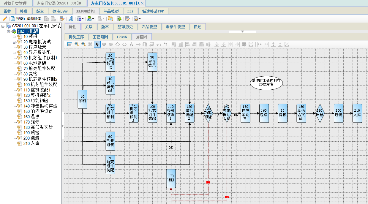 通過在工序流程圖中增加回轉線、標注圖形、判定等圖形,能清晰和直觀的表達工序間的流轉。開目eCOL PLM 8.0新版本支持電裝、機裝、裝調等多專業(yè)的協(xié)同工作,支持自定義串行或并行的裝配過程,以及自動生成和輸出工序流程圖,用于生產(chǎn)車間的工作指導或展示等;支持在任意地方添加批注,醒目且直觀地體現(xiàn)工序流程圖的需注意事項;支持回退線用于滿足裝調等專業(yè)的調試需求,清晰地表達調試工藝過程中根據(jù)檢測結果來決定工序走向的情況。